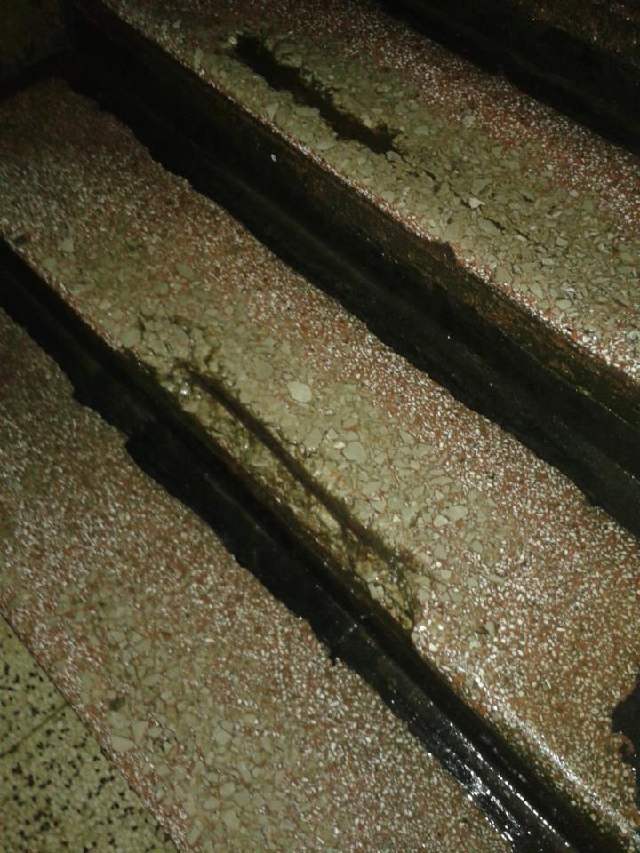 Seconda rampa, particolare: scalino rotto in un giorno di pioggia.