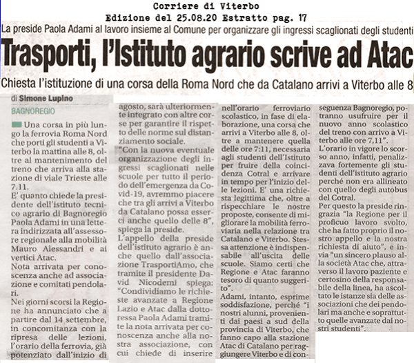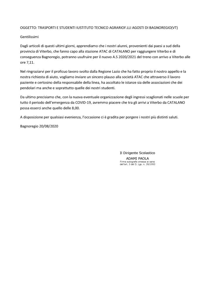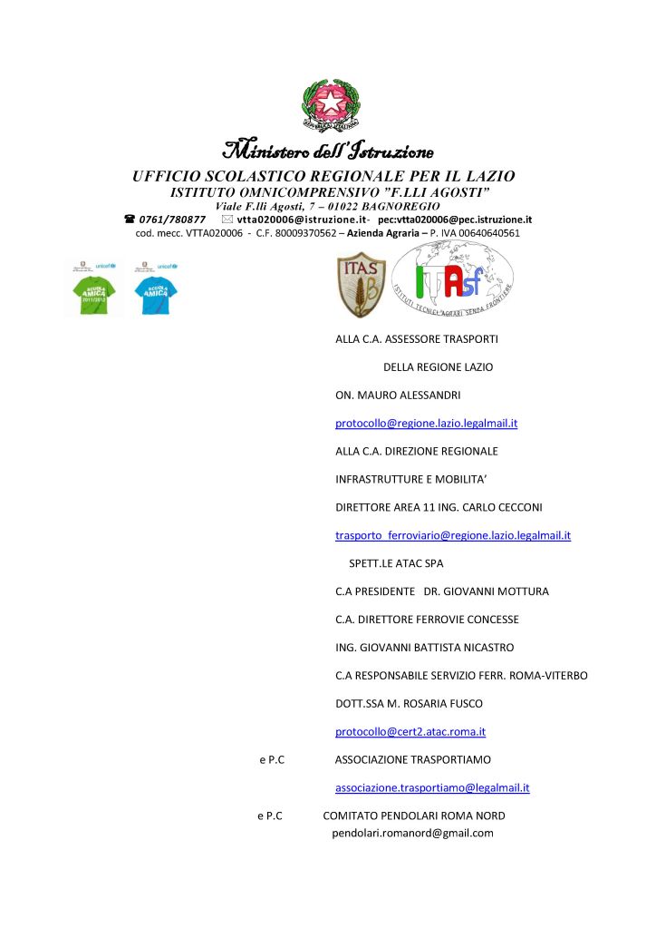 Il Dirigente Scolastico dell’Istituto Comprensivo di Bagnoregio (VT) qualche giorno fa ha scritto ai referenti regionali dei trasporti, incluso l’Assessore, a ATAC e in copia anche l’Associazione Trasportiamo e noi del comitato pendolari ferrovia roma nord per ringraziare dell’aumento delle corse su treno per far spostare gli studenti.