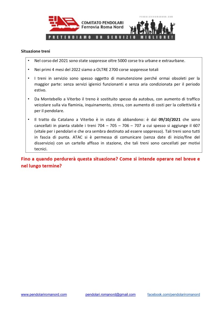 Chiediamo quindi anche al Comune di Roma, che è coinvolto, di garantire i diritti dei pendolari e per questo vogliamo le risposte alle nostre domande.