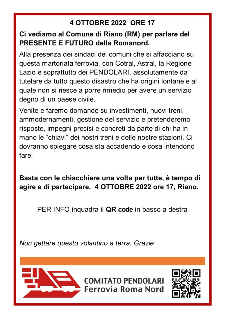 Ci vediamo il 4 ottobre 2022, dalle ore 17 alle 19 nella sala consiliare del comune di Riano, con i Sindaci, i municipi coinvolti, Cotral, Astral, Anas, Regione Lazio e soprattutto con i pendolari che tutti i giorni pagano un biglietto o un abbonamento per NON AVERE il servizio.