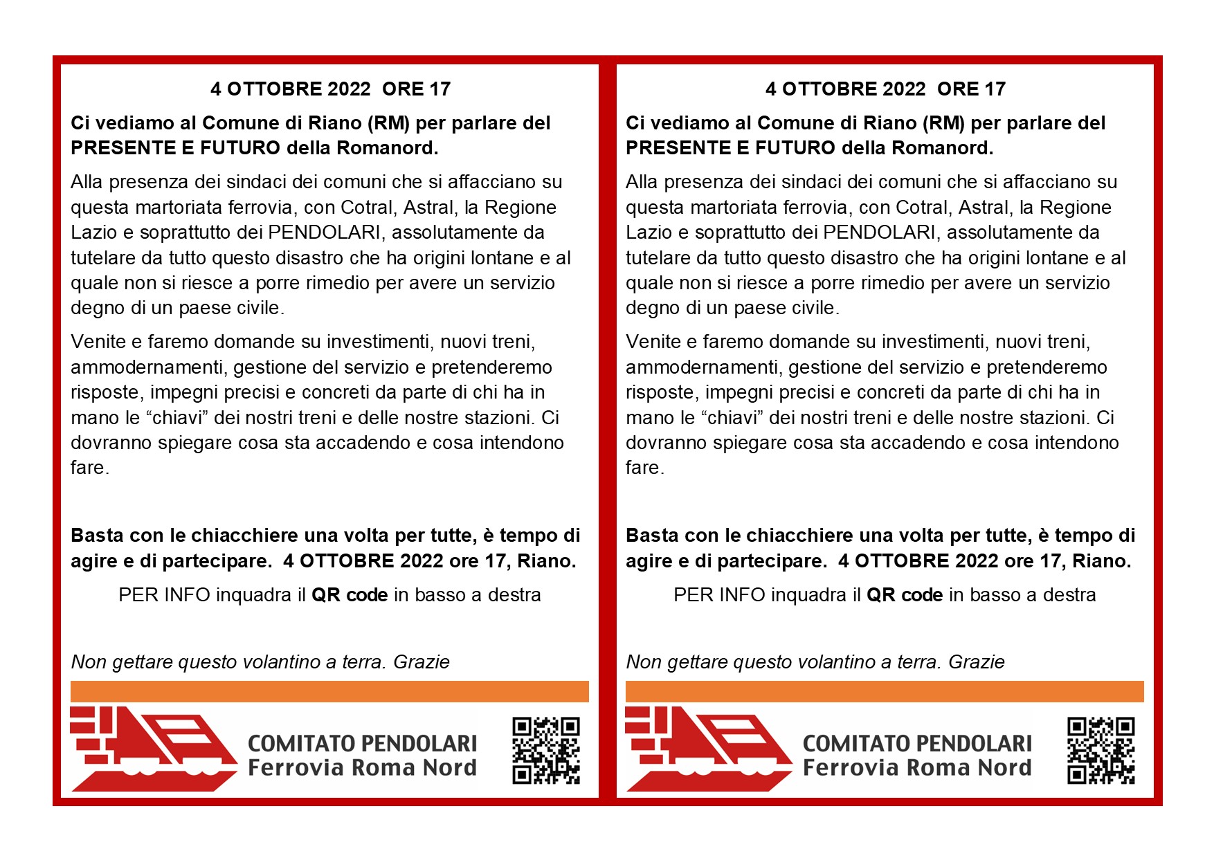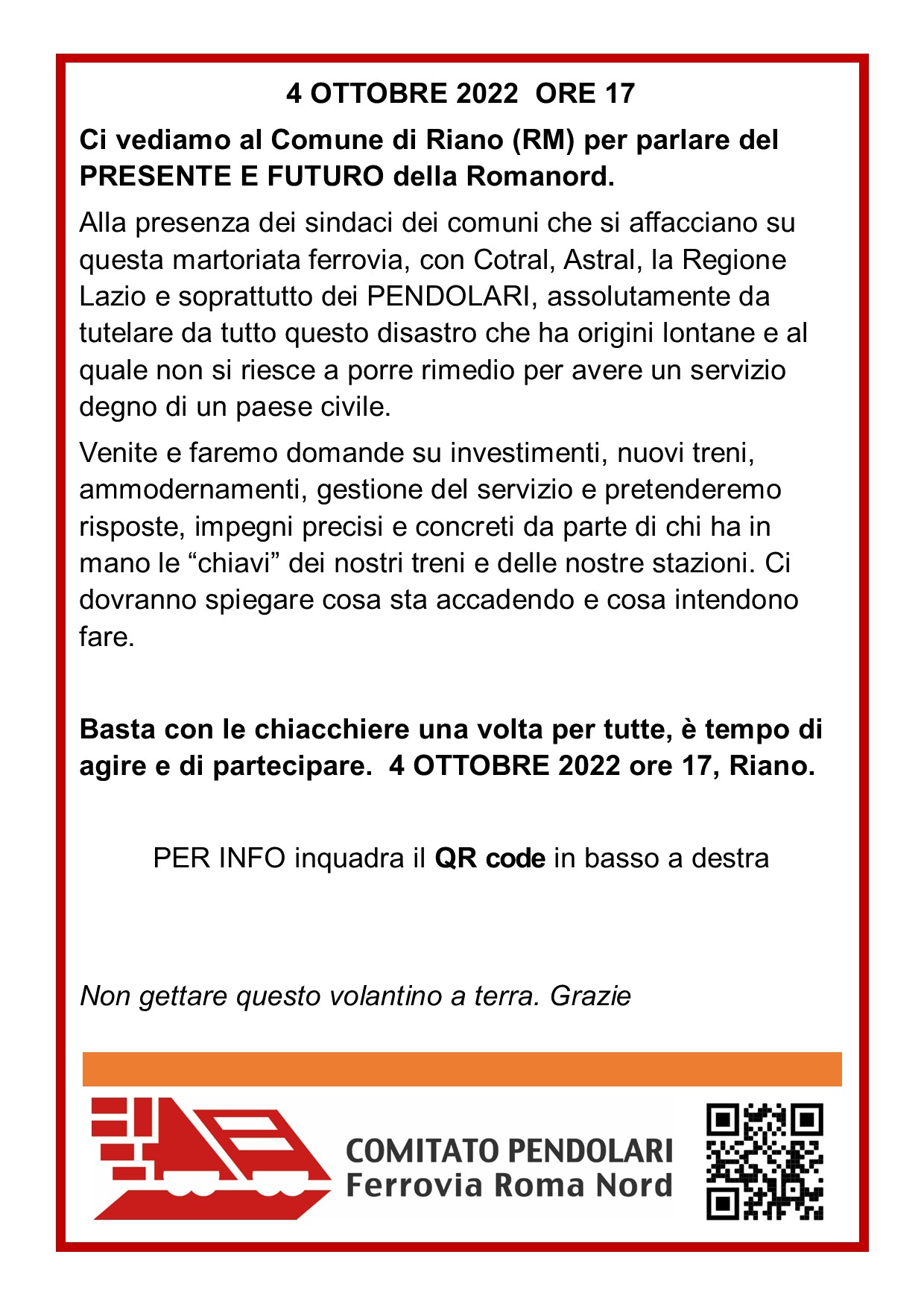 Ci vediamo il 4 ottobre 2022, dalle ore 17 alle 19 nella sala consiliare del comune di Riano, con i Sindaci, i municipi coinvolti, Cotral, Astral, Anas, Regione Lazio e soprattutto con i pendolari che tutti i giorni pagano un biglietto o un abbonamento per NON AVERE il servizio.
