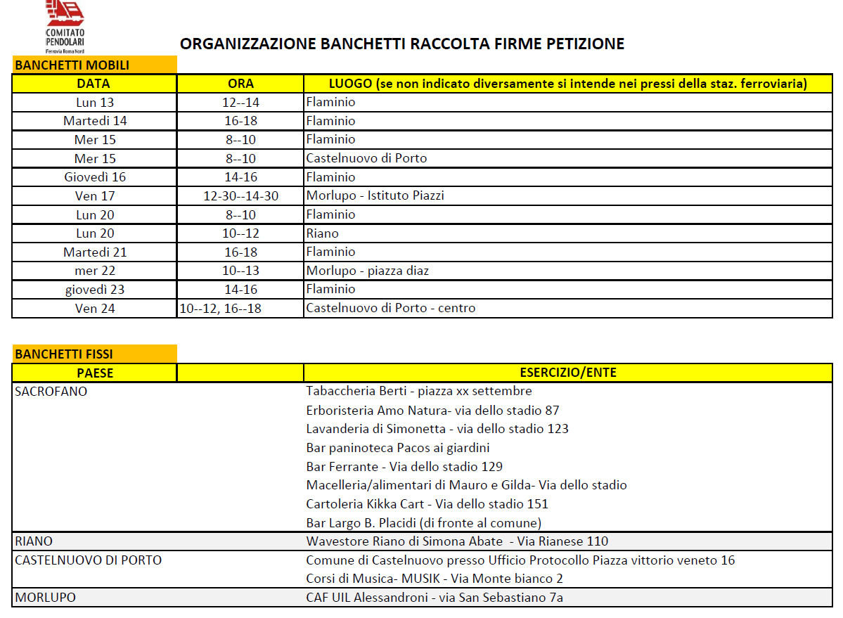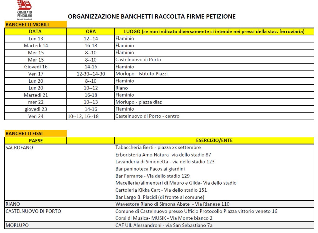 Sotto abbiamo riepilogato data e fascia indicativa del banchetto (autorizzato dalla Questura di Roma) con l’indicazione del luogo: dove non è presente una indicazione precisa si intende sempre in prossimità della stazione, su suolo pubblico.
